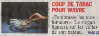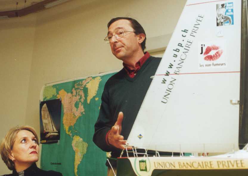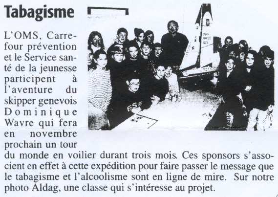 Le CIPRET-Genève (prévention du tabagisme) et la FEGPA (prévention de l'alcoolisme) - tous deux membres de Carrefour Prévention - et le Service de santé de la jeunesse -avec le soutien du Programme de prévention du tabagisme de l'Organisation Mondiale de la Santé- ont développé un partenariat associant le message de prévention au plaisir. En novembre prochain, Dominique sera le premier Suisse à disputer le Vendée Globe 2000 : plus de 3 mois en solitaire, sans escale, autour du monde. Pour cela, Dominique a trouvé tout d'abord l'appui de très nombreuses communes suisses qui ont donné 10 cts par habitant, puis de généreux sponsors pour la construction du voilier