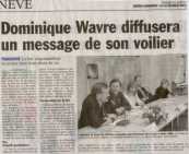 et images télévision et internet, visibles depuis la rue. Nous serons en outre reliés à Dominique par liaisons radiotéléphoniques et internet, avec des news sur www.prevention.ch (site de Carrefour Prévention), www.sante-jeunesse.ch (site du SSJ), www.dominiquewavre.com (site de Dom), www.ubp.ch (site du sponsor principal) et le site officiel www.vendeeglobe.com. Assurément, Dominique sera le skipper le plus internaute de la planète ! Naturellement tous les sites genevois seront reliés. Parallèlement, nous lancerons avec le Service de Santé de la Jeunesse un Concours dans les écoles genevoises avec de superbes prix individuels (voyages, abonnements cinéma, CD, etc,) et la possibilité pour des classes de venir converser en direct des Océans avec Dominique. Cette opération " Vendée Globe 2000 " et son skipper genevois Dominique Wavre symbolisent pour nous l'aventure, la prise de risque " calculée ", la prévention (Dominique a cessé de fumer et boit très modérément !), le dépassement de soi-même, la confiance en soi, la ténacité, la forme à conserver en vue de l'exploit, le but à atteindre, etc. Pour le partenariat Dr Jean-Charles Rielle - Tél. Air Call 318 52 31 - Fax 329 11 27 - jcrielle@iprolink.ch Tribune de GE 19/2/00 GHI 24/2/00 www.vendeeglobe.com Vendée Globe 2000 |