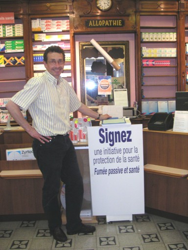 dans son officine et signant l'Initiative au stand de la rue de Carouge