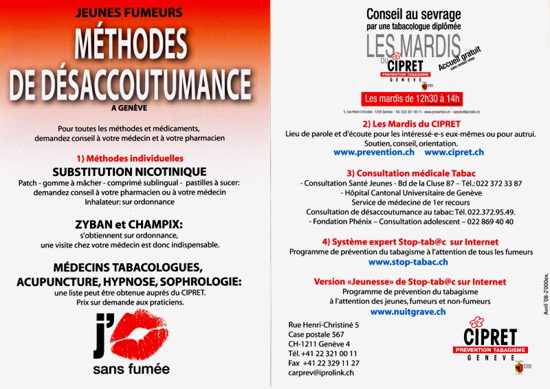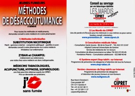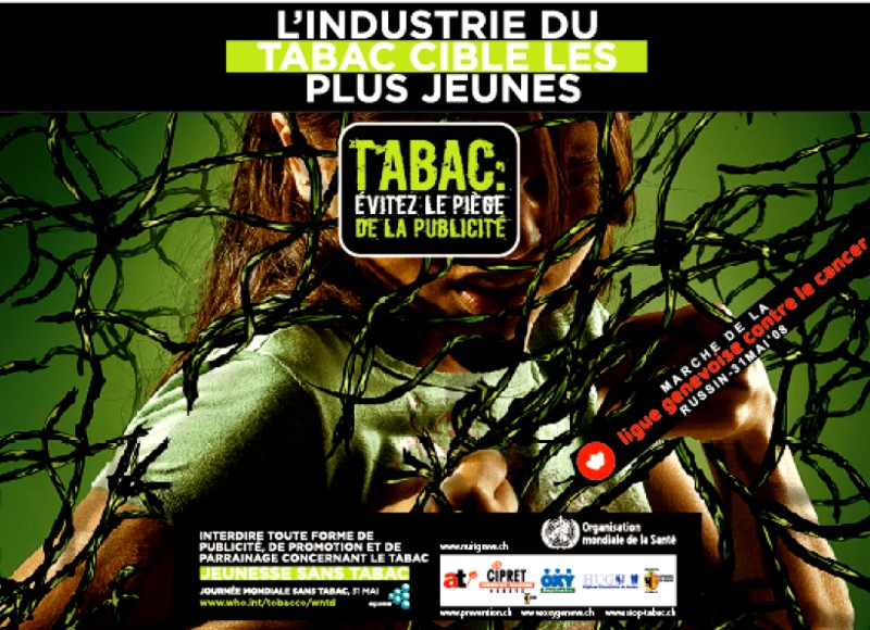 Programme - Genève: Mai Activités dans certaines écoles genevoises avec le Service de santé de la jeunesse du 26 mai au 8 juin Affichage OMS et Mardi du CIPRET-Genève sur les Trams et Bus TPG jeudi 29 mai Hôpitaux Universitaires de Genève en collaboration avec le CIPRET-Genève vendredi 30 mai Organisation Mondiale de la Santé OMS Stand du CIPRET-Genève samedi 31 mai RUSSIN Marche de la Ligue Genevoise contre le Cancer Stand du CIPRET-Genève |