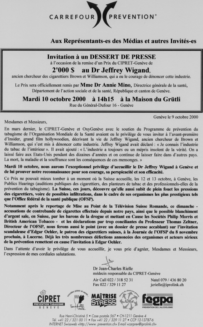 et le Dr Jean-Charles Rielle, remettant le Prix du CIPRET-Genève au Dr Jeffrey Wigand!