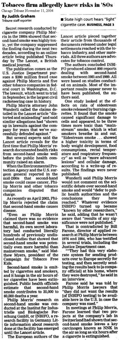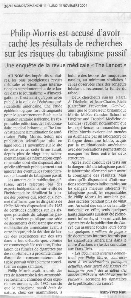 Cet important rapport du US Surgeon General sur la fumée passive a été rendu public le 27 juin 2006. Il est aussi disponible à l'adresse suivante: http://www.surgeongeneral.gov/library/secondhandsmoke/. C'est le deuxième rapport sur ce sujet venant de cette prestigieuse institution de santé publique, le premier datant de 1986, il y a 20 ans. A remarquer que le Chapitre 1 - Introduction, résumé et conclusions contient dans sa conclusion une brève section sur l'industrie du tabac dénonçant le fait que celle-ci s'est engagée dans un large éventail d'activités qui sont allées bien au-delà des pratiques scientifiquement acceptables. Et le US Surgeon Général donne comme références pour étayer sa déclaration une liste réduite de cinq articles et un livre. Parmi les cinq articles se trouve l'article du Lancet, ce qui le place au rang des références essentielles permettant de dénoncer le comportement de l'industrie du tabac.