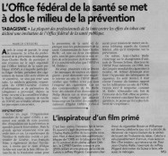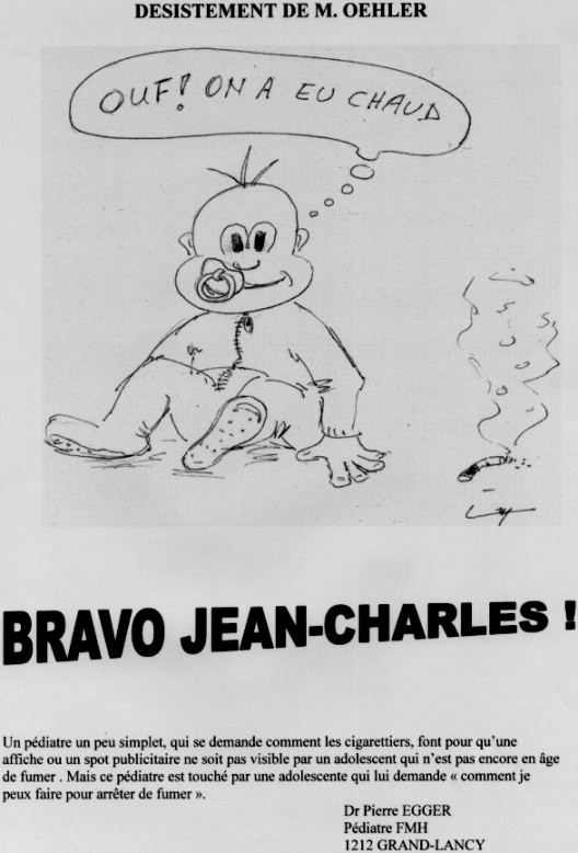 Selon des contacts informels, j'ai appris avec reconnaissance que certaines collaboratrices et certains collaborateurs de l'OFSP seraient satisfaits de la polémique actuelle concernant la venue d'Edgar Oehler. On peut en effet imaginer qu'en tant que professionnels-elles de la santé publique, ils souhaitent que leur Office agissent au niveau du tabac avec le même succès qu'au niveau du sida et des toxicomanies illégales. Il est vrai et au regard des budgets alloués 2M5 au tabac et plus de 10M pour le sida et plus de 10M pour les toxicomanies illégales qu'il n'y a pas de lobbys légaux pour devenir séropositif ou pour s'injecter de l'héroïne!