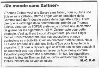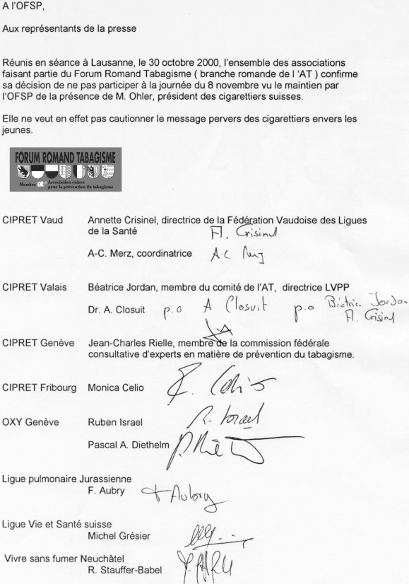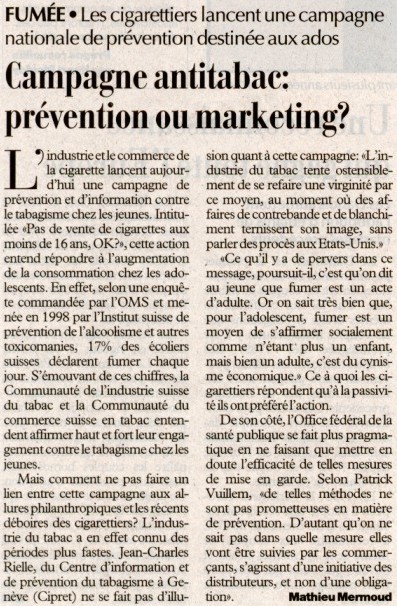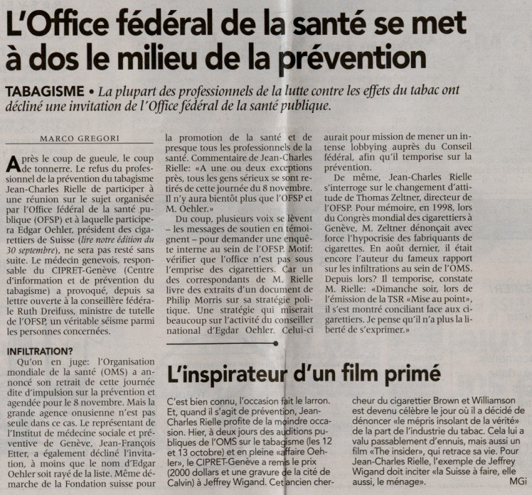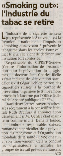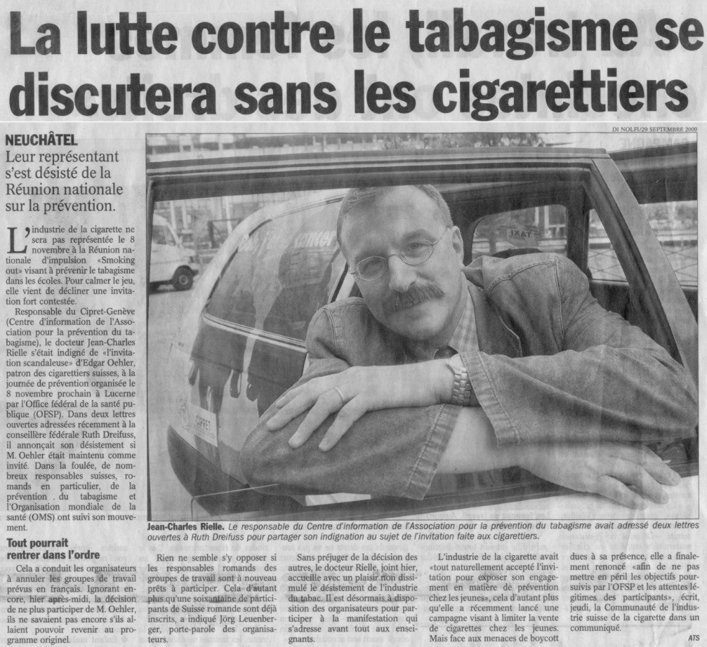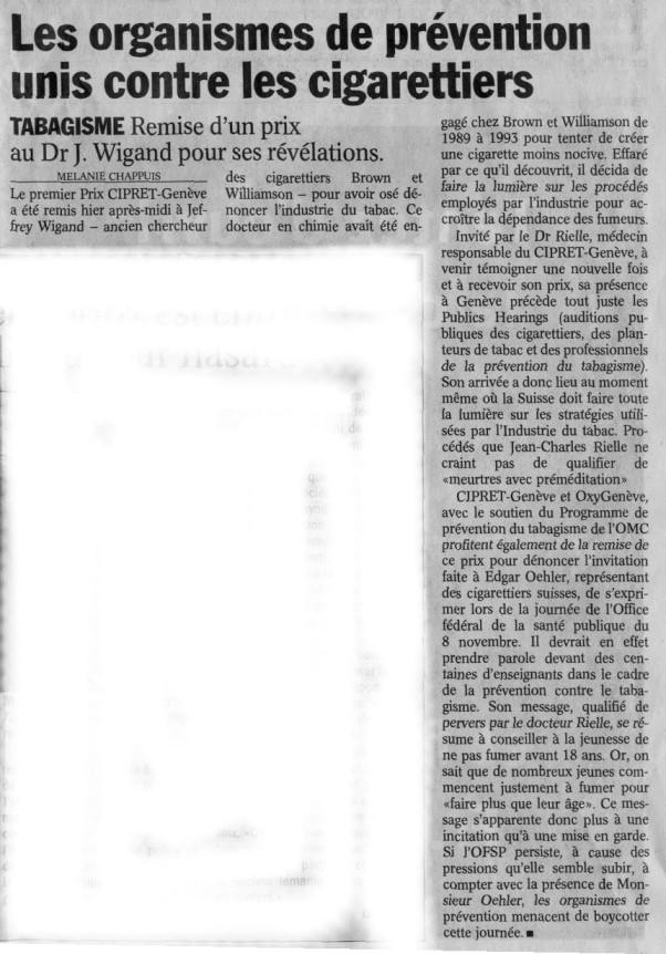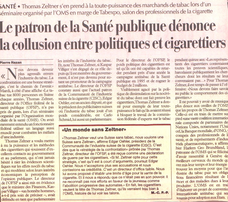 Lettre ouverte aux planteurs de tabac - Geneva Public Hearings Le Matin 14.10.00 24Heures 12.10.00 |