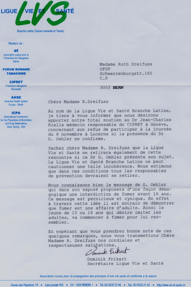 Lettre de Dominik Frikart, Secrétaire Ligue Vie et Santé
