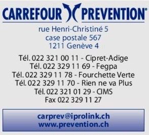 Communiquer, informer et agir pour promouvoir la santé de la population genevoise Carrefour Prévention réunit des associations investies dans la prévention et la promotion de la santé. Une promotion qui passe par la communication et l'information sur l'équilibre alimentaire, la maîtrise du stress, la prévention de l’alcoolisme, du tabagisme et du jeu excessif. Carrefour Prévention promeut leurs actions sur le plan cantonal et dispose d'une antenne ouverte au public dans le quartier de Plainpalais, en Ville de Genève, où chacun peut trouver écoute, informations, conseils et aide. Un site internet www.prevention.ch propose une véritable arcade virtuelle sur plus de 20 thèmes de santé. Les Genevoises et les Genevois connaissent bien Carrefour Prévention présent depuis sa fondation, il y a plus de 15 ans, dans de nombreuses manifestations publiques, sportives et culturelles, pour sensibiliser la population à toutes ces problématiques. Carrefour Prévention est subventionné par la République et le canton de Genève, par son Département de l'économie et de la santé. Il bénéficie aussi du soutien de la Ville de Genève. |