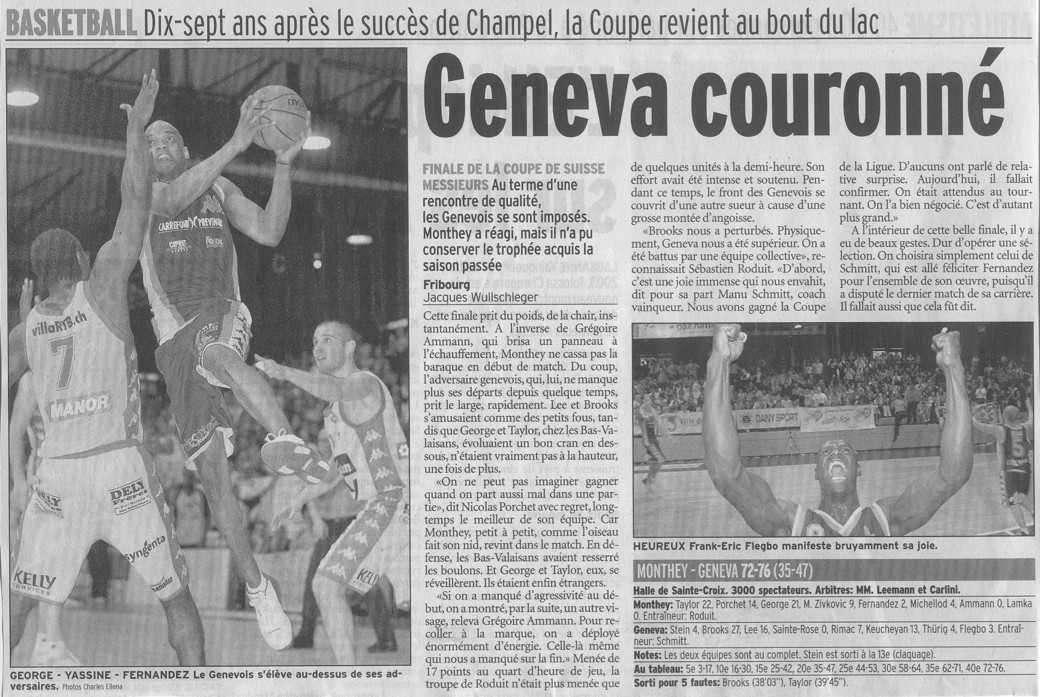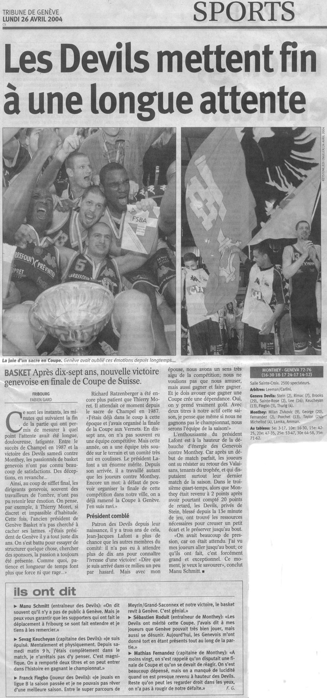 Bravo aux Geneva Devils qui gagnent la Coupe Suisse 2004, face à Monthey!