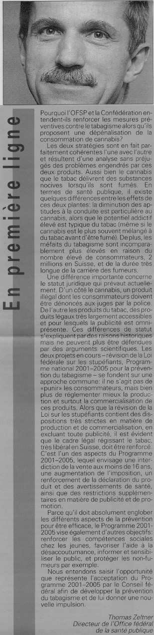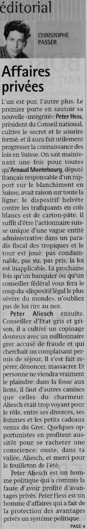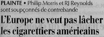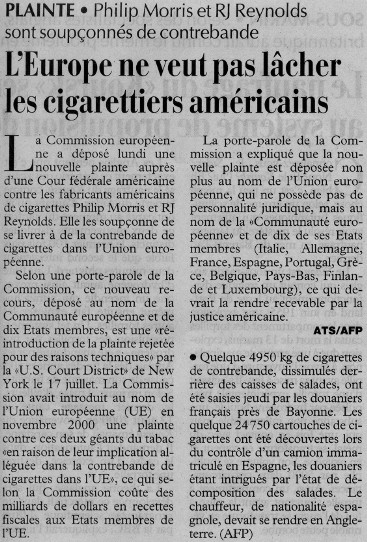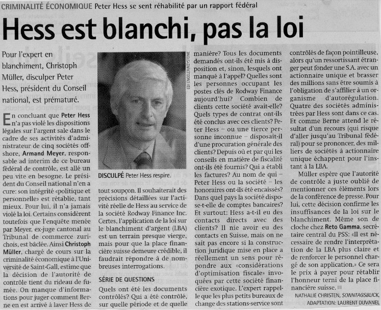 http://www.sunday-times.co.uk/news/pages/sti/2001/07/22/stinweins01003.html des ex-dirigeants de BAT UK admettent maintenant que cette société était directement impliquée dans la contrebande de cigarettes. Etant donné que la Suisse est une plaque-tournante importante dans les réseaux de contrebande de cigarettes, il n'est pas difficile de présumer que Peter Hess a été lui aussi impliqué dans ce trafic, en tant qu'administrateur de BATI en Suisse jusqu'à sa récente démission, et en tant que collègue politique de son alter ego britannique, l'ex-chancellier Kenneth Klarke. Il est en tout cas probable qu'il devait avoir connaissance de ce trafic. En cachant son mandat d'administrateur de la multinationale de tabac, il se peut que Peter Hess ait tenté de dissimuler beaucoup plus que l'occupation d'un simple siège au sein du conseil d'administration de BATI. On peut parier qu'il reste beaucoup de choses à découvrir sur ce personnage, qui n'a pas fini de faire parler de lui - malheureusement à chaque fois en jetant un peu plus le discrédit sur l'institution ! dont il a la plus haute charge, le Conseil National. |
