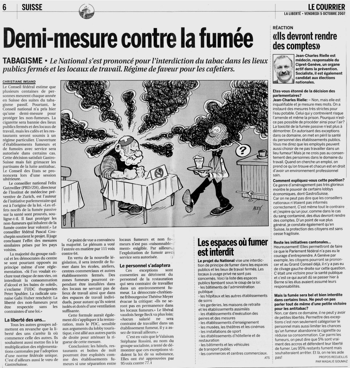 Entretien avec Jean-Charles Rielle. Dès le premier janvier 2008, la fumée sera bannie des lieux publics français. En Suisse, pas d'interdiction globale pour le moment. Genève s’apprête à voter sur ce sujet en février. Invité : Jean-Charles Rielle, conseiller national socialiste et médecin-conseil du Centre d’information pour la prévention du tabagisme.