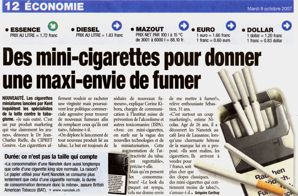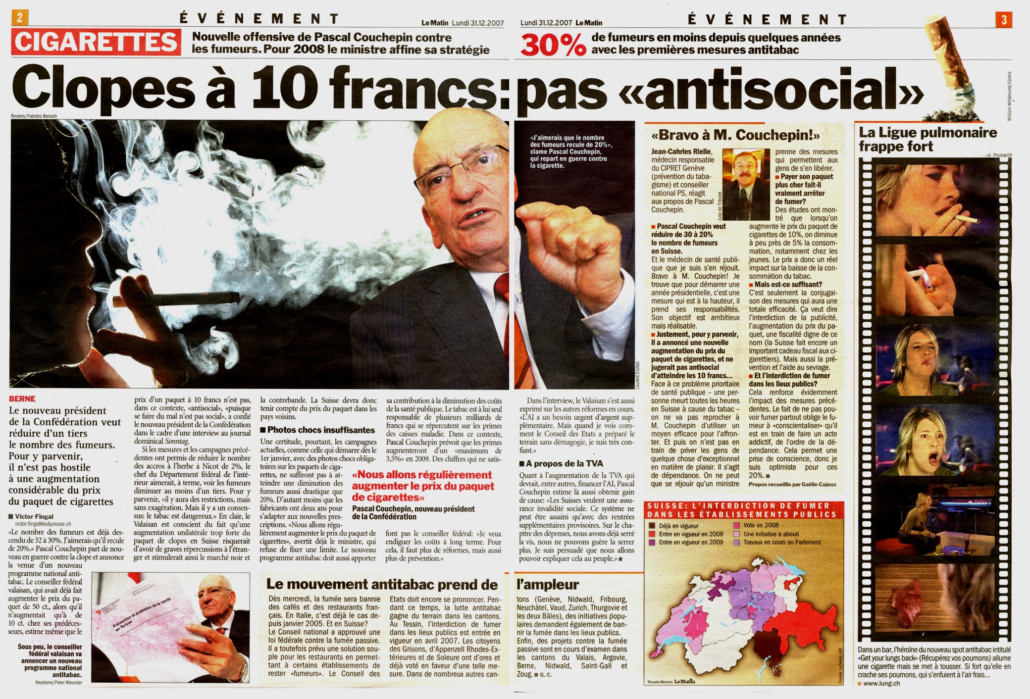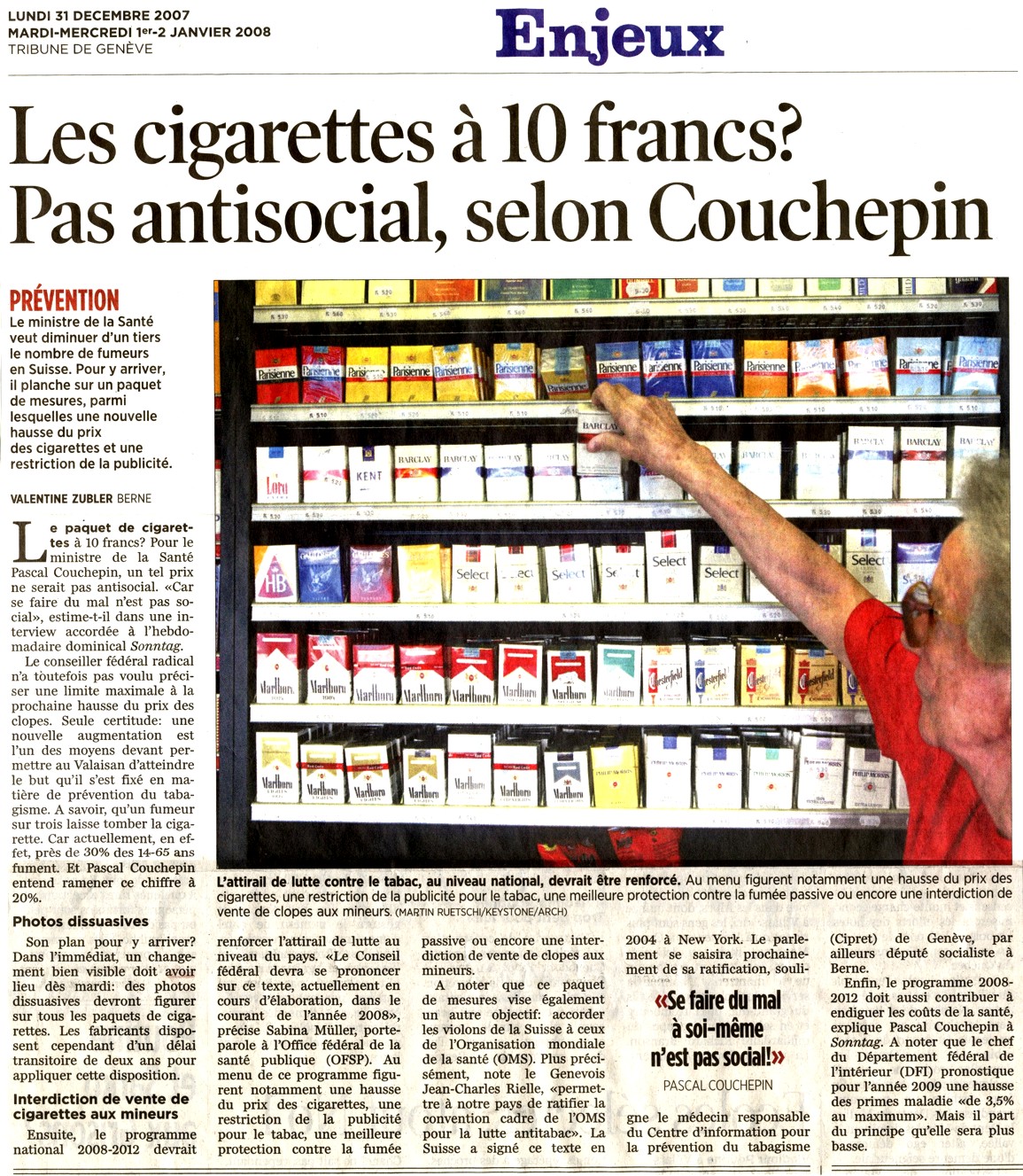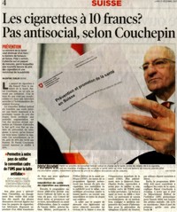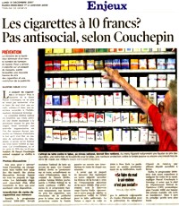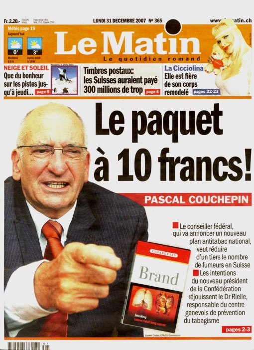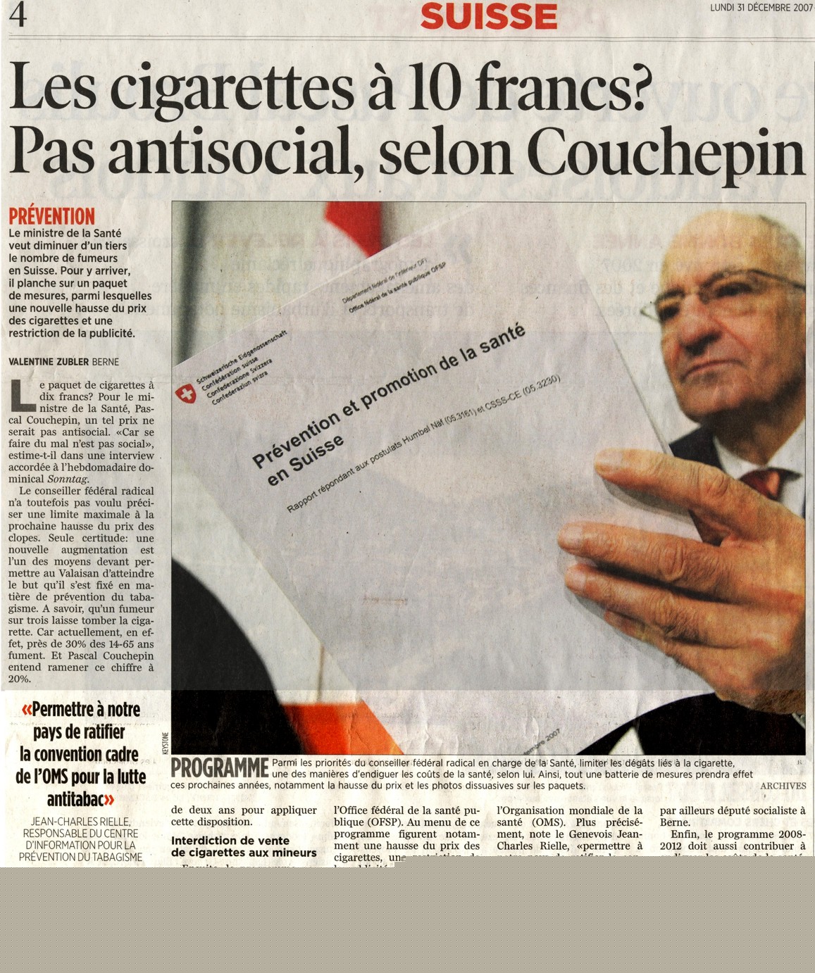 Cigarettes : un paquet à 10 francs ? Pascal Couchepin est favorable à l’augmentation du prix des cigarettes pour réduire le nombre de fumeurs en Suisse. Sur le vif : Pascal Diethelm , président de l'association « OxyRomandie », qui lutte contre la fumée passive.