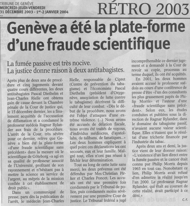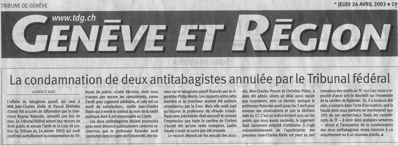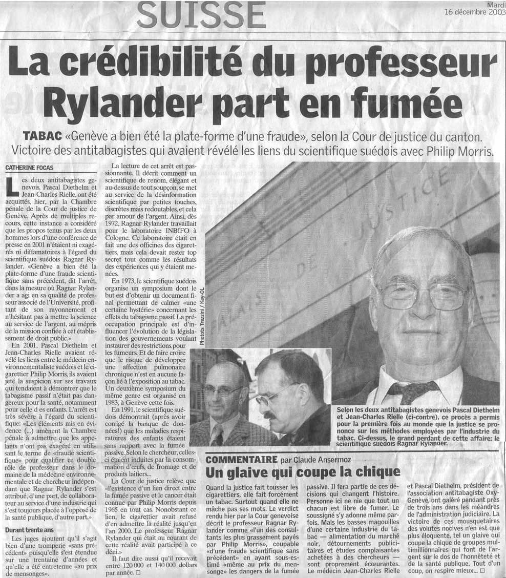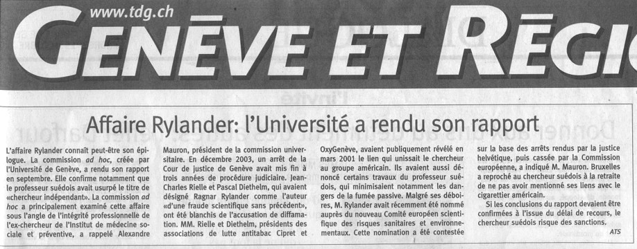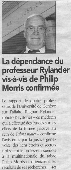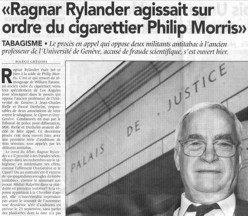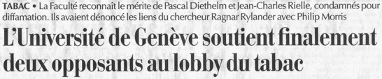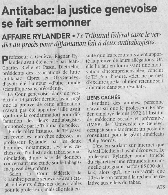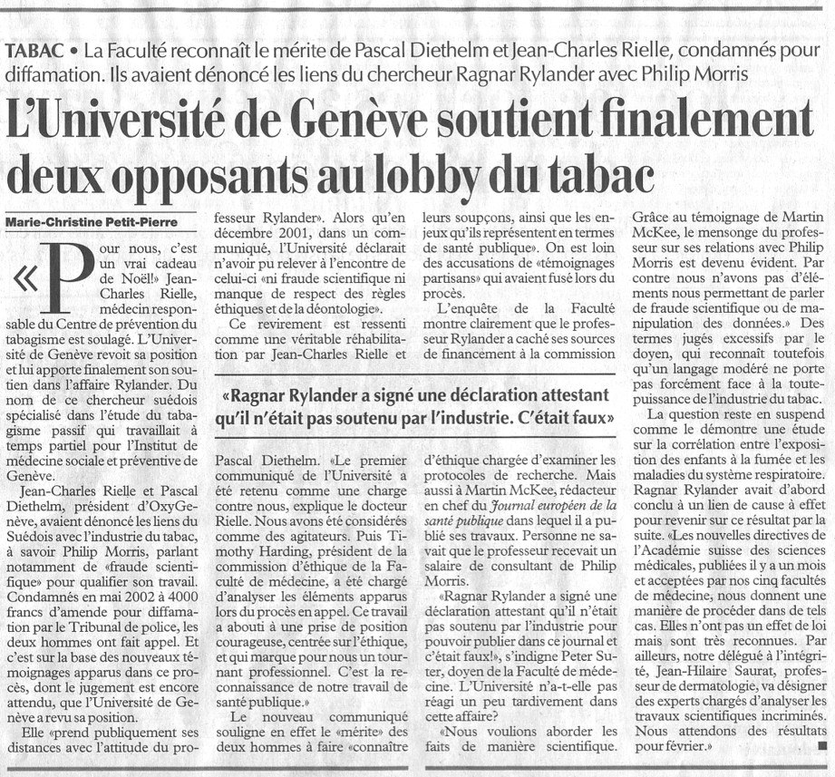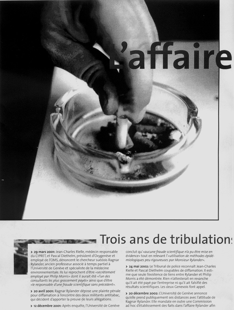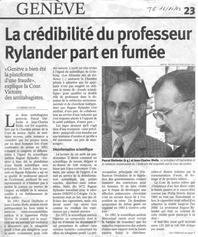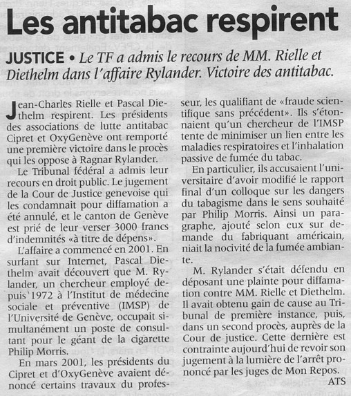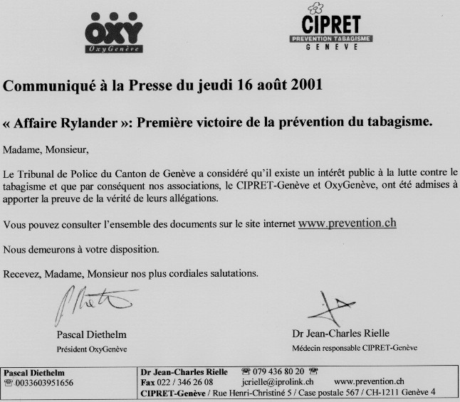 MM. Rielle et Diethelm, présidents des associations de lutte anti-tabac Cipret et OxyGenève, avaient publiquement révélé en mars 2001 le lien qui unissait M. Rylander au groupe américain. Ils avaient aussi dénoncé certains travaux du professeur suédois, qui minimisaient notamment les dangers de la fumée passive.