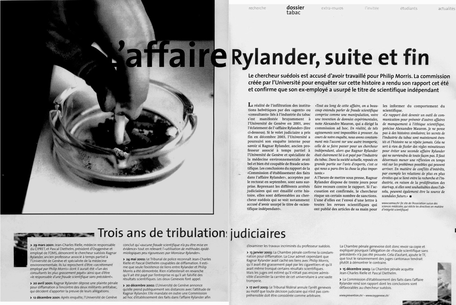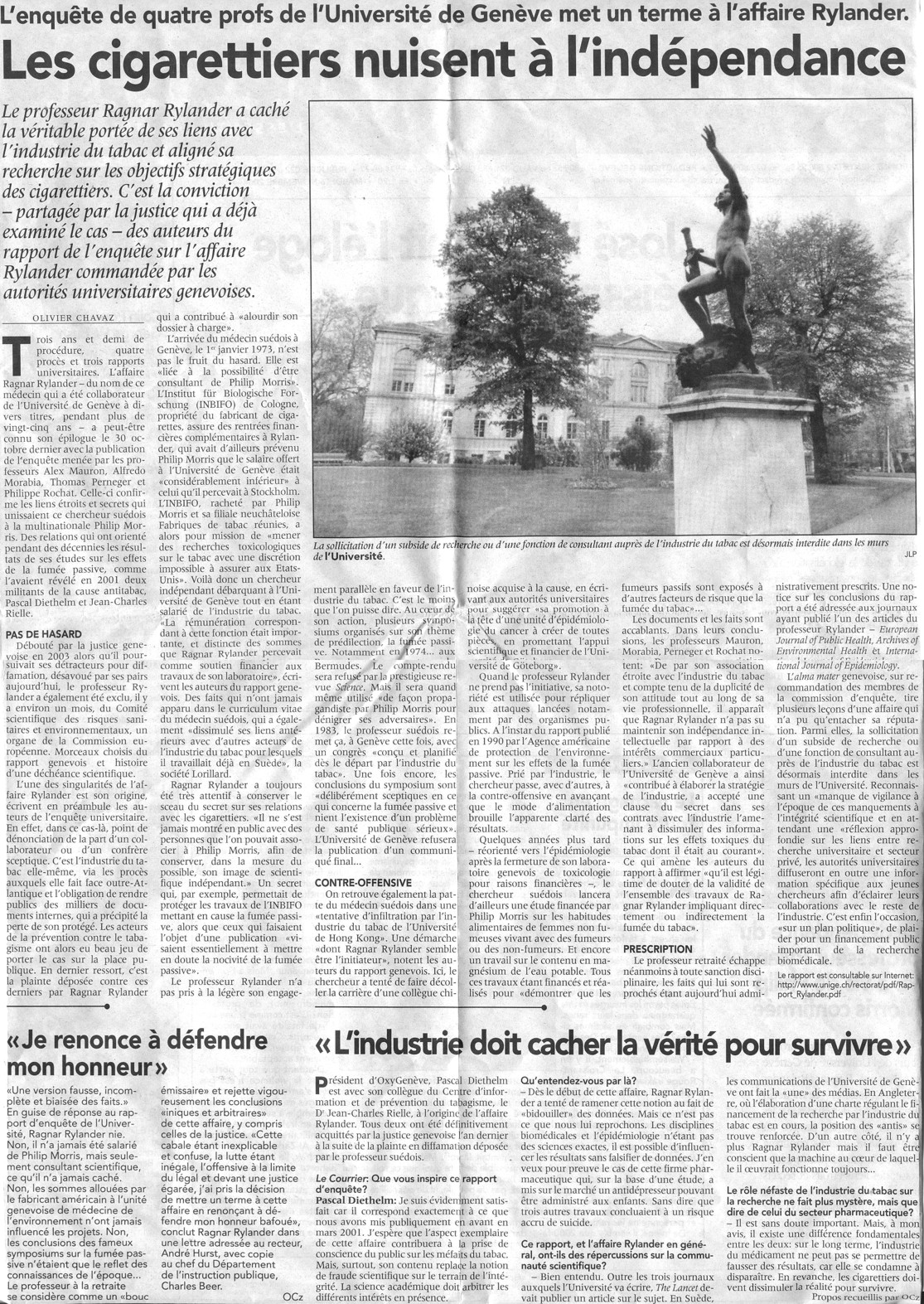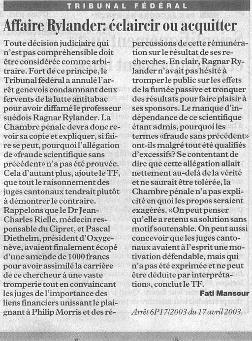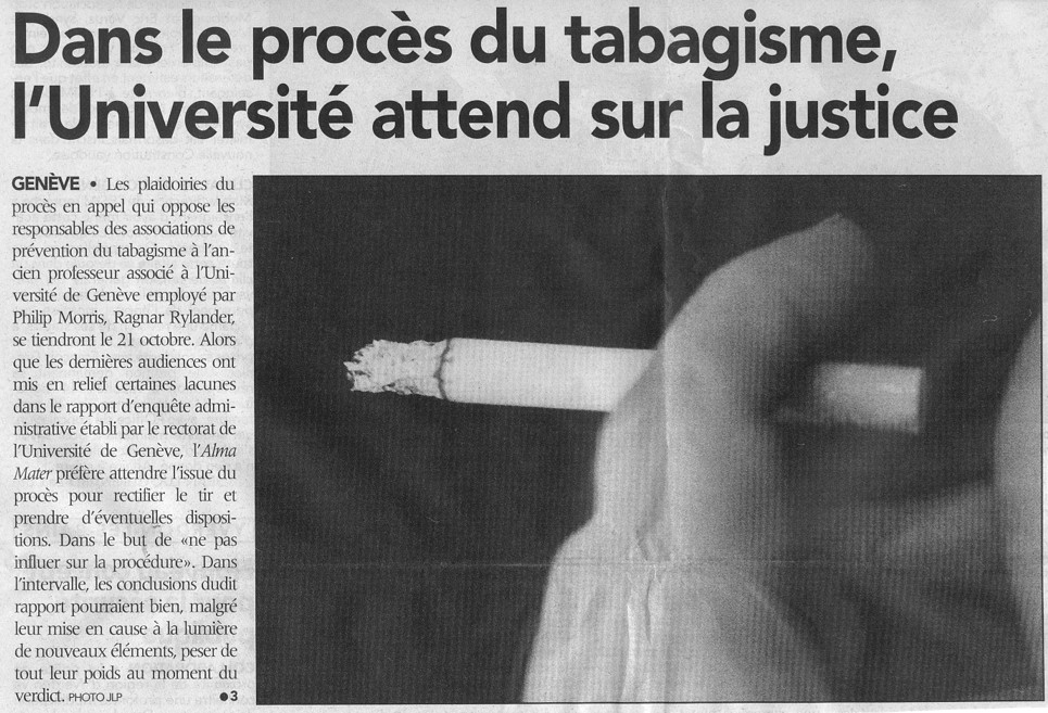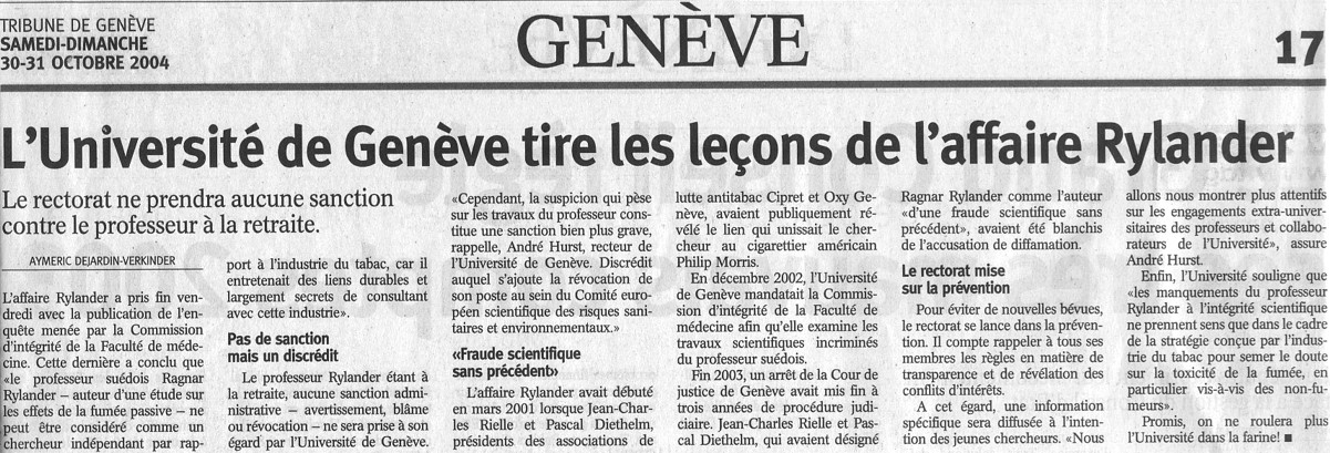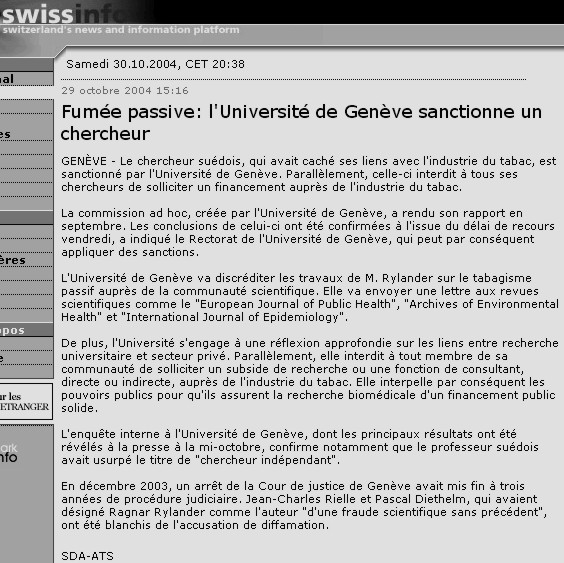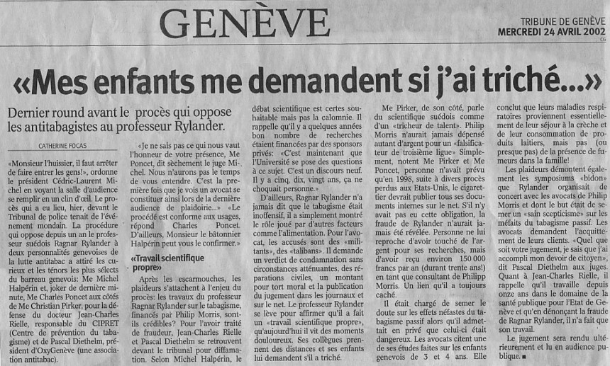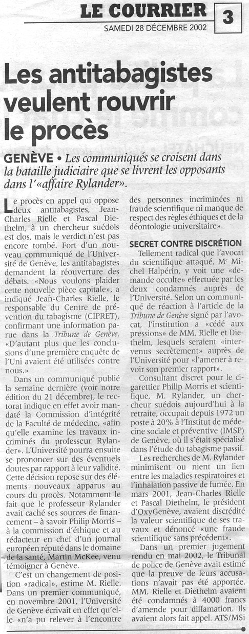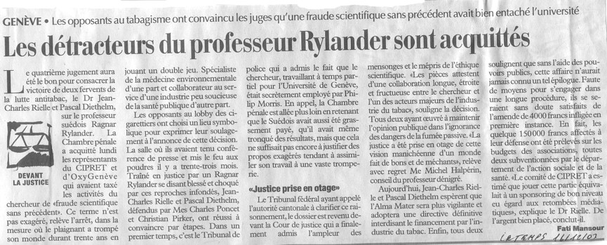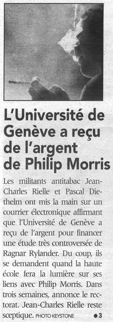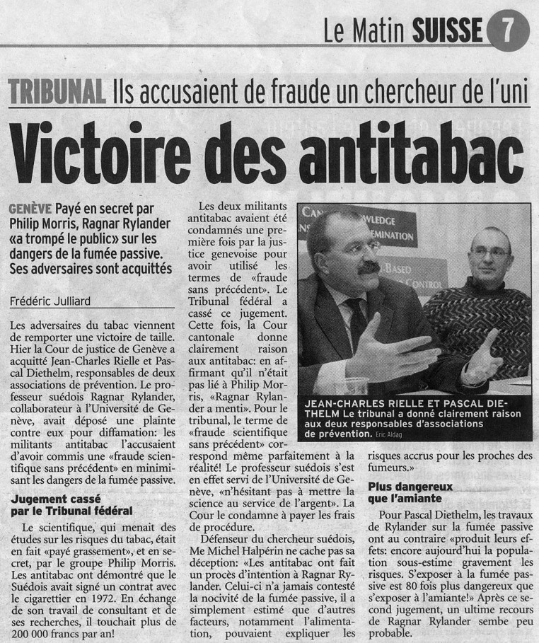 MM. Rielle et Diethelm, présidents des associations de lutte anti-tabac Cipret et OxyGenève, avaient publiquement révélé en mars 2001 le lien qui unissait M. Rylander au groupe américain. Ils avaient aussi dénoncé certains travaux du professeur suédois, qui minimisaient notamment les dangers de la fumée passive.