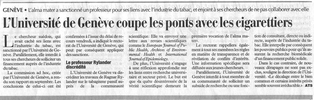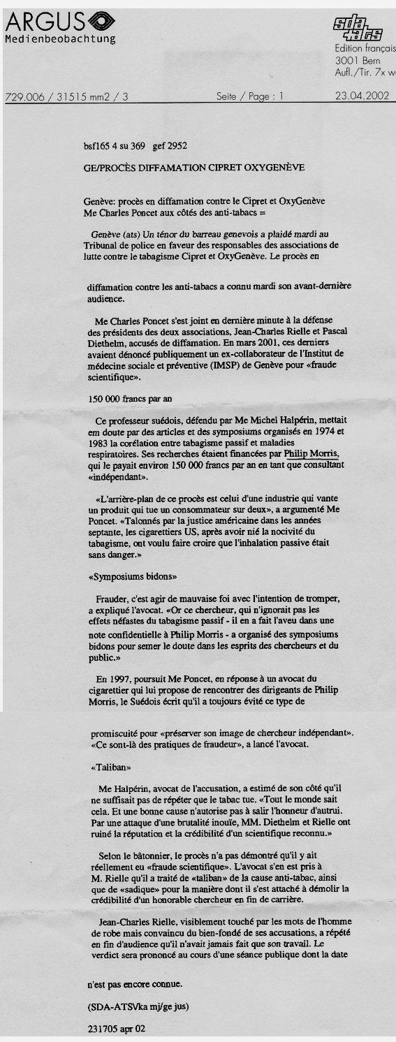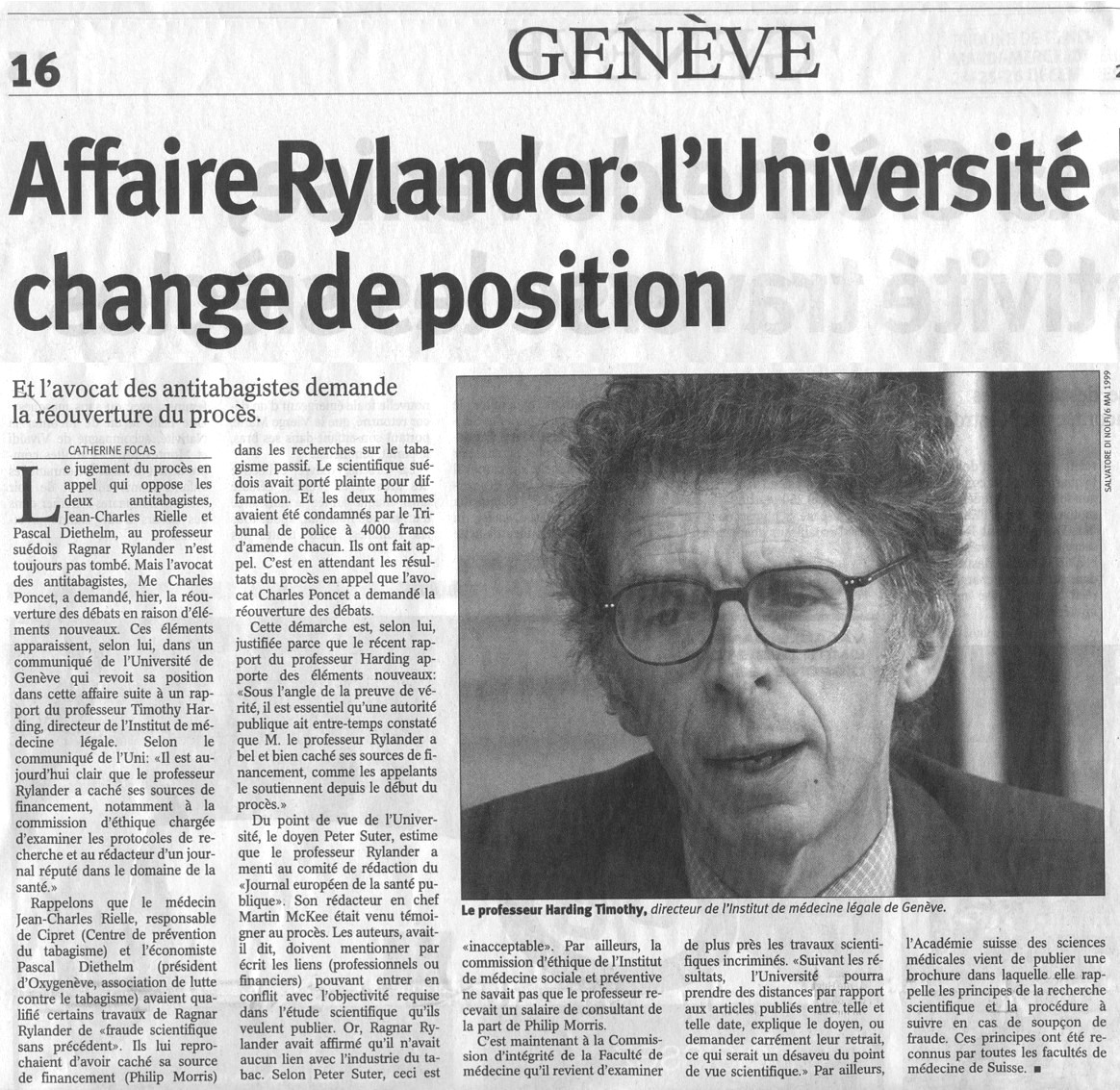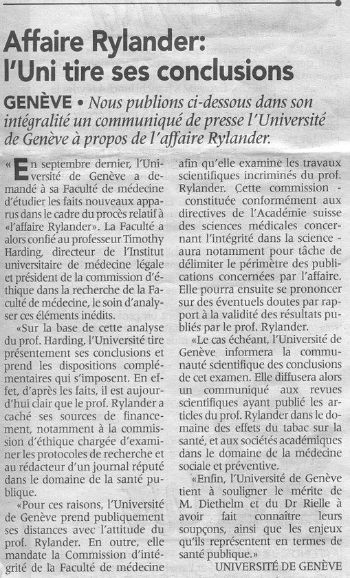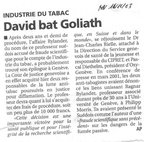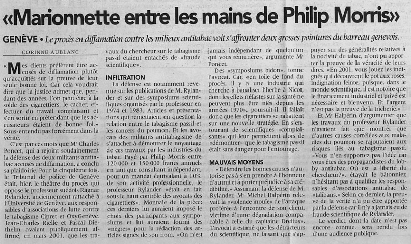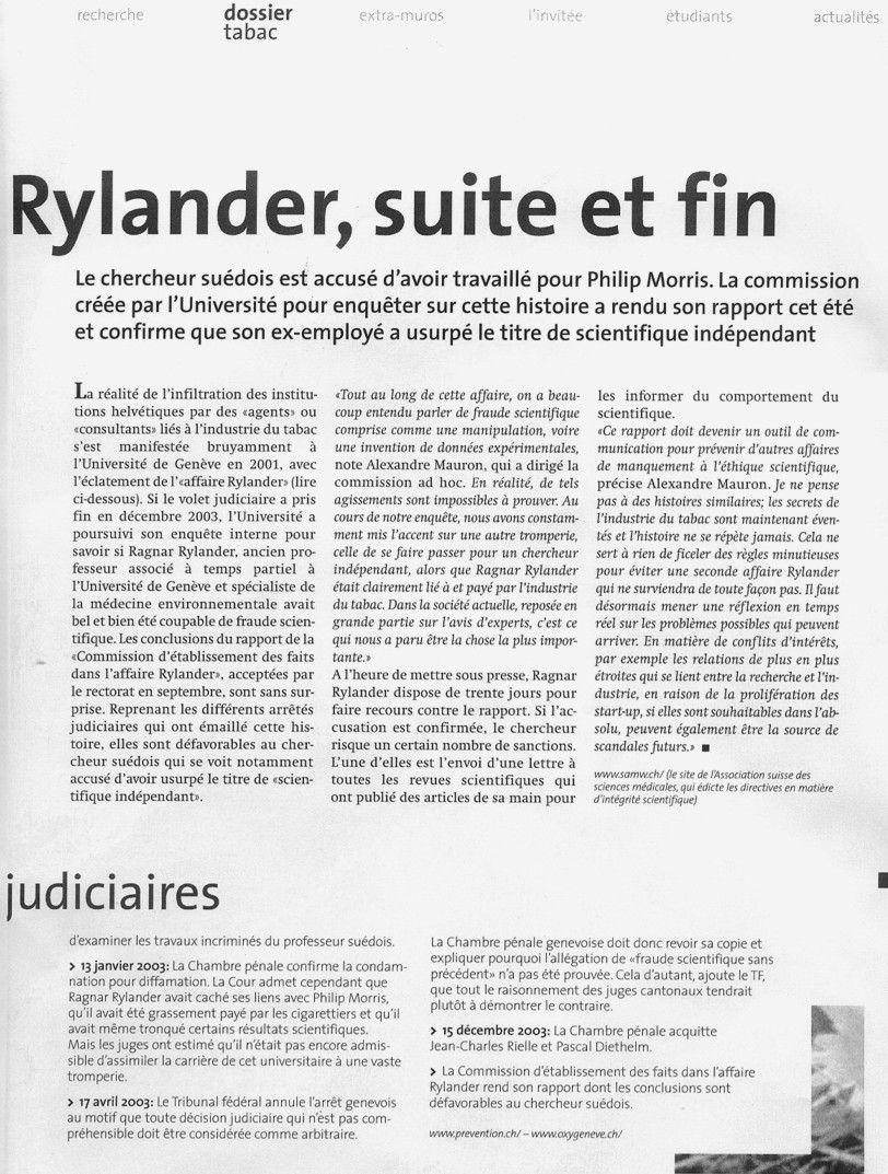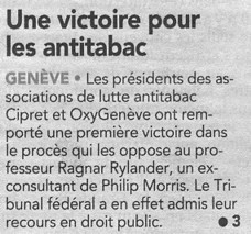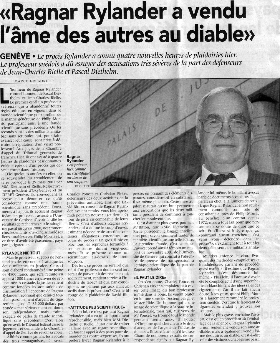 MM. Rielle et Diethelm, présidents des associations de lutte anti-tabac Cipret et OxyGenève, avaient publiquement révélé en mars 2001 le lien qui unissait M. Rylander au groupe américain. Ils avaient aussi dénoncé certains travaux du professeur suédois, qui minimisaient notamment les dangers de la fumée passive.