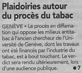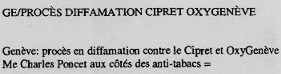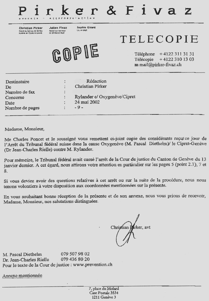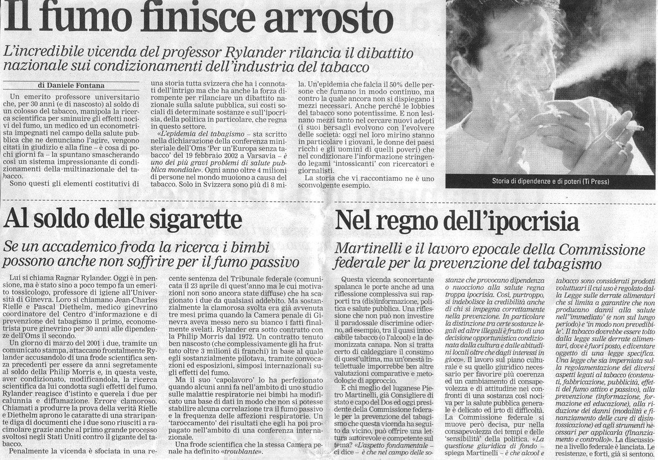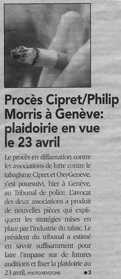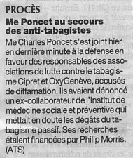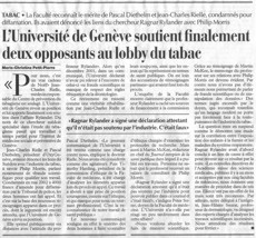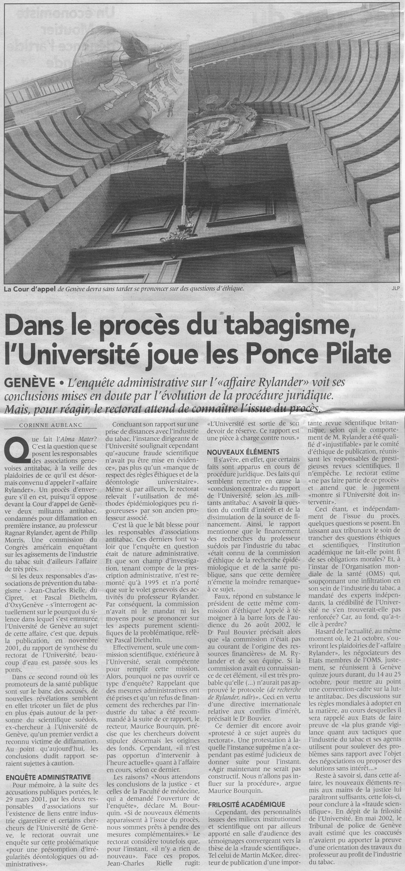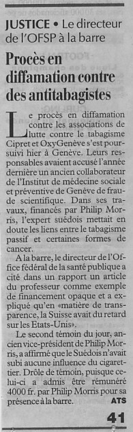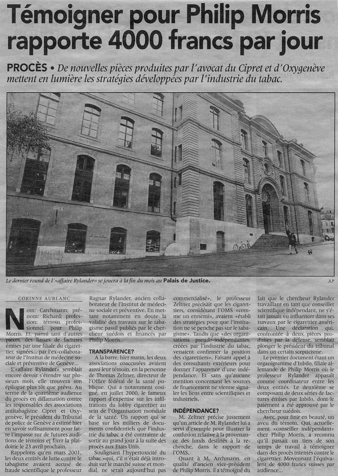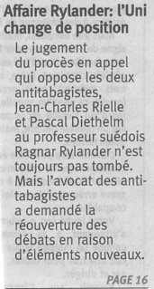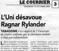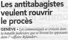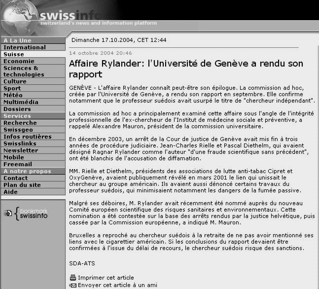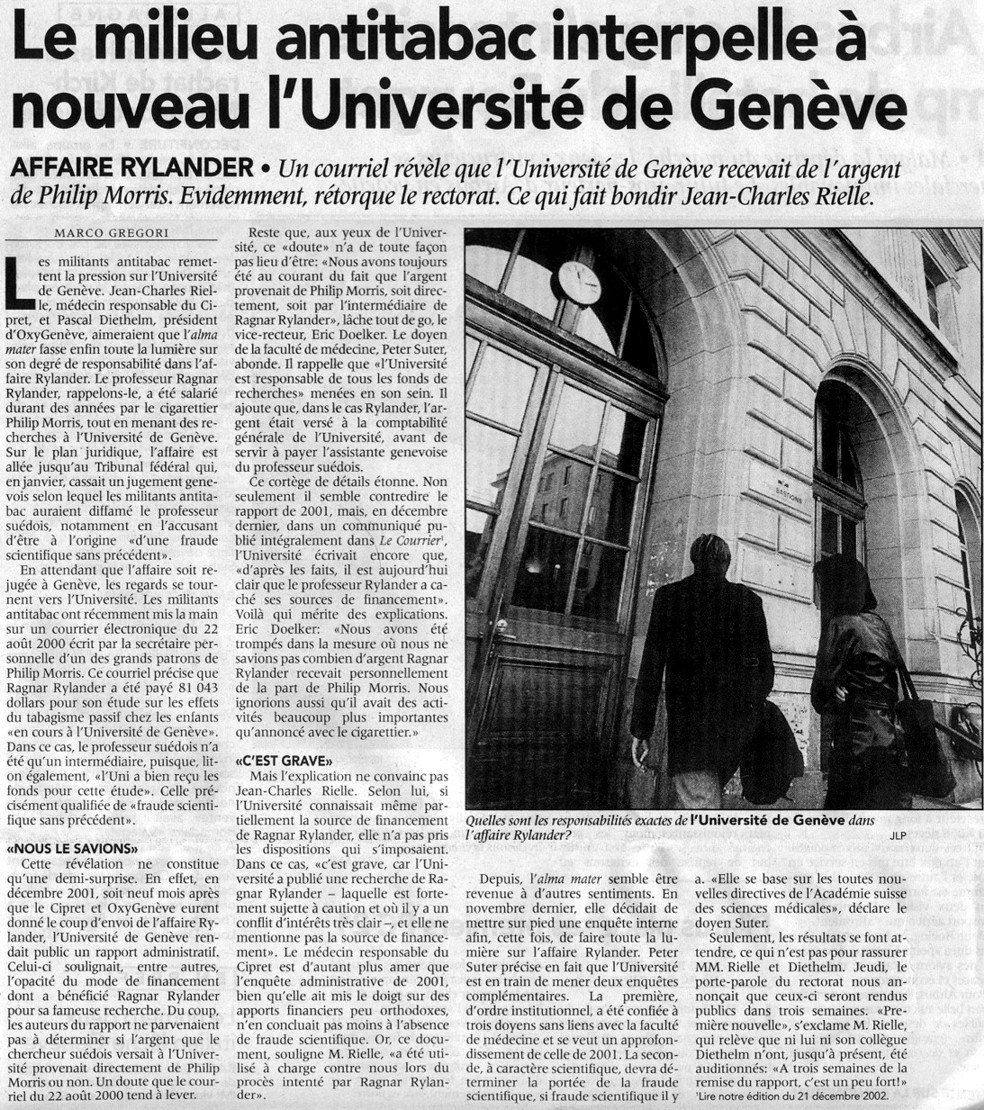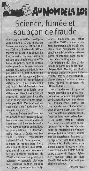 MM. Rielle et Diethelm, présidents des associations de lutte anti-tabac Cipret et OxyGenève, avaient publiquement révélé en mars 2001 le lien qui unissait M. Rylander au groupe américain. Ils avaient aussi dénoncé certains travaux du professeur suédois, qui minimisaient notamment les dangers de la fumée passive.