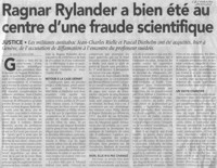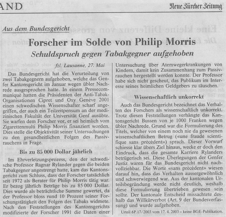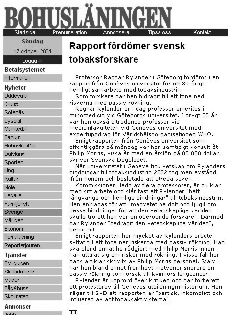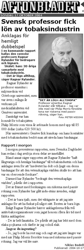 Karl-Eric Tallmo, a Swedish journalist, has written an extensive account on the Rylander case in the Swedish science magazine Dagens Forskning (Today's Science), No. 12, 10-11 June 2002, entitled "Philip Morris assigned secret grants to Swedish professor". Rylander replied to the article, denying most of its claims. His extensive comments were printed in issue No. 15, 12-13 August, of Dagens Forskning.