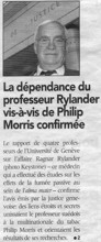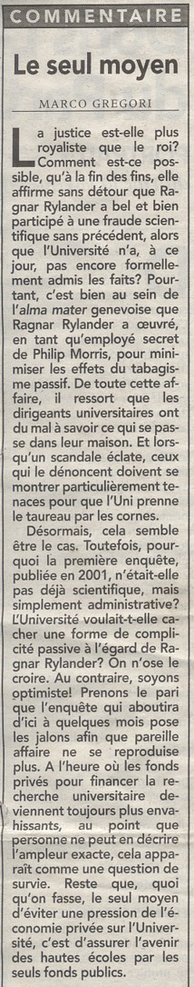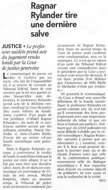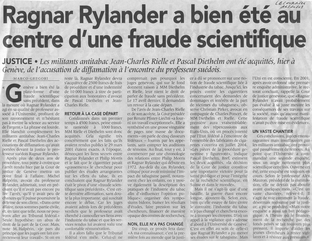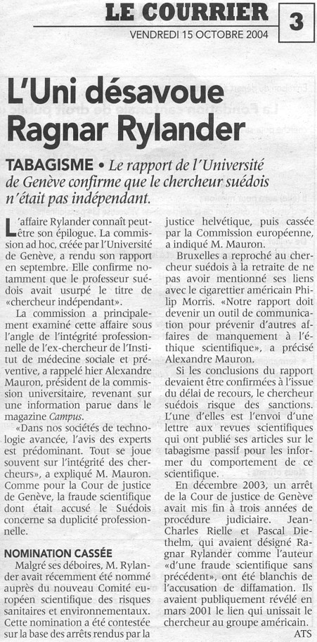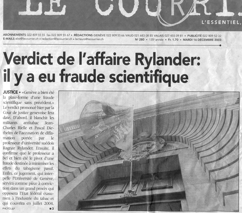 Ce verdict met fin à une longue procédure. MM. Rielle et Diethelm avaient désigné Ragnar Rylander comme l'auteur "d'une fraude scientifique sans précédent", pour avoir été consultant du cigarettier Philip Morris, alors qu'il travaillait à l'Institut de médecine sociale et préventive de l'Université de Genève.