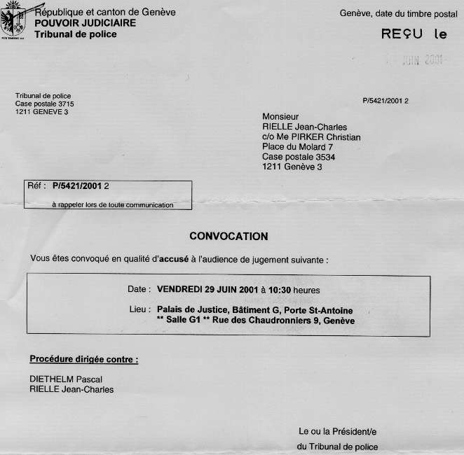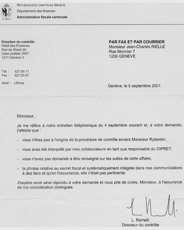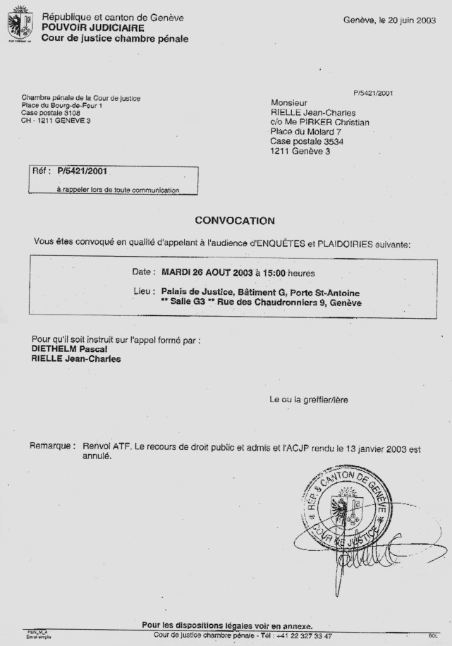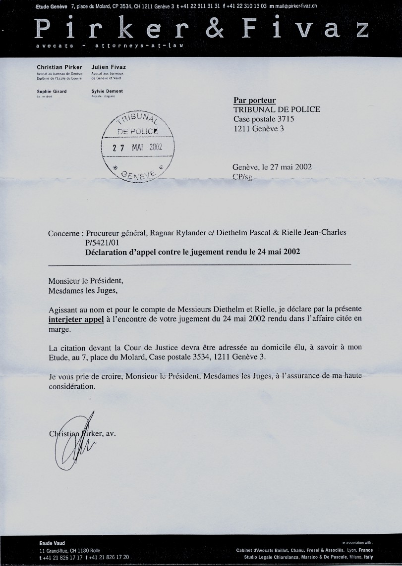 Rylander Case - Geneva Court of Justice - Session of 26 August 2002 - Status report