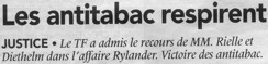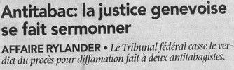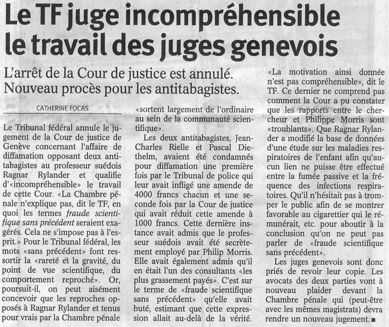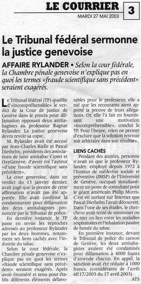 Devant la presse, les deux anti-tabagistes avaient parlé d'une "fraude scientique sans précédent" commise par "l'un des consultants les plus grassement payés par Philip Morris". Le professeur Rylander, s'estimant diffamé, avait porté l'affaire devant la justice. Le Tribunal de police avait condamné les deux anti-tabagistes à une amende de 4000 francs chacun. En appel, la Chambre pénale avait ramené ce montant à 1000 francs. MM. Rielle et Diethelm ont alors recouru au Tribunal fédéral, qui a cassé le jugement genevois, le qualifiant d'"incompréhensible".