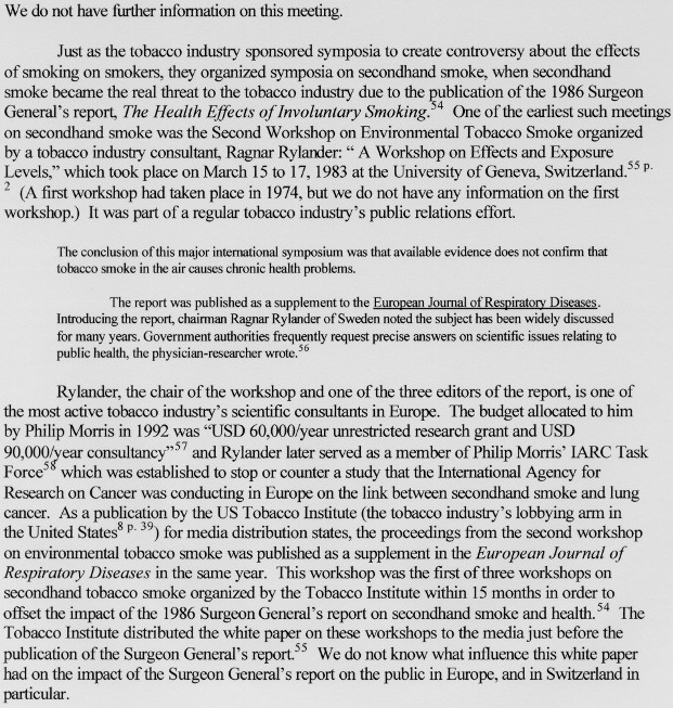 En 1983 se tient à Genève et sous l'égide de l'Université de Genève le deuxième " Symposium Rylander " sur le tabagisme passif. Les conclusions de ce symposium, largement favorables aux thèses de l'industrie du tabac, seront abondamment reprises et citées par cette dernière. Nous allons examiner quelques documents retraçant l'histoire de ce symposium. Ces documents montrent à quel point cette manifestation s'inscrivait dans une stratégie d'ensemble de l'industrie du tabac, et illustrent le niveau d'implication des avocats de l'industrie dans la recherche scientifique sur la fumée environnementale.