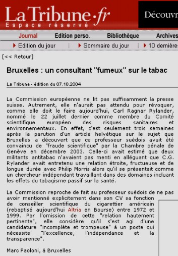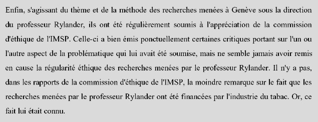 Courrier électronique interne à Philip Morris entre Ted Sanders, "principal scientist" et assistant du directeur à Cathy Ellis, "senior vice-president", Worlwide Scientific Affairs, Philip Morris. "L'étude chinoise cas-témoins ne peut pas être financée par le CIAR [l'organisation écran de l'industrie du tabac qui a été abolie par la justice américaine dans le cadre de Master Settlement Agreement]. [Nous] pensons qu'il y a de nombreuses raisons pour lesquelles cette étude doit aller de l'avant et j'ai examiné les possibilités que cela puisse se faire. Du point de vue des scientifiques chinois qui participent à ce projet, nous en avons déduit qu'ils auraient des difficultés à accepter de l'argent venant directement des compagnies de tabac. Toutefois, Ragnar Rylander a été impliqué - en tout cas d'une manière marginale - dans le projet lors de sa phase pilote, qui est, come vous le savez, terminée, et il serait plus que disposé à être utilisé, lui même ou l'Université de Göteborg, comme sponsor de l'étude, le financement en étant assuré par Philip Morris." On voit que Philip Morris envisage un mécanisme consistant à utiliser l'Université de Göteborg comme institution écran pour "blanchir" son argent et ainsi contourner l'obstacle causé par le sens de l'éthique des chercheurs chinois, mécanisme qui repose sur la complicité de Ragnar Rylander, qui dans l'esprit des hauts cadres de Philip Morris apparaît comme acquise sans l'ombre d'une hésitation.