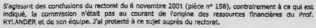 Rylander indique qu'il a soumis un budget pour la poursuite en 2000 de son travail de consultant et ses déplacements - confirmant par la même qu'il travaille comme consultant pour la multinationale. Il confirme que son étude genevoise sur les enfants est bien financée par Philip Morris (alors qu'aucune mention de ce financement n'est indiquée dans l'article sur cette étude publié dans Archives of Environmental Health). Rylander rappelle que Philip Morris a soutenu financièrement ses activités scientifiques à Genève depuis l'année 1974. Sans le financement de Philip Morris, il ne sera pas capable de payer les salaires de son personnel à Genève dans deux semaines (c'est à dire en janvier 2000). Le personnel est donc dans une situation de précarité dont l'issue dépend entièrement des arrangements financiers "occultes" (mot utilisé par le Tribunal de police dans son jugement) entre Rylander et Philip Morris. Finalement, on apprend que Rylander a commencé une nouvelle étude et qu'il a déjà recruté 250 personnes sur le terrain pour y participer.