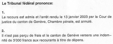 (plaidoiries du mardi 26 août 2003) suite à la décision du Tribunal fédéral incluant les considérants
