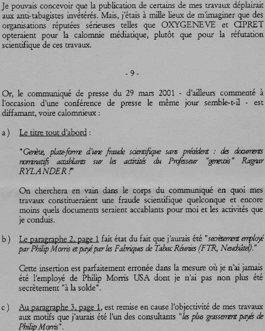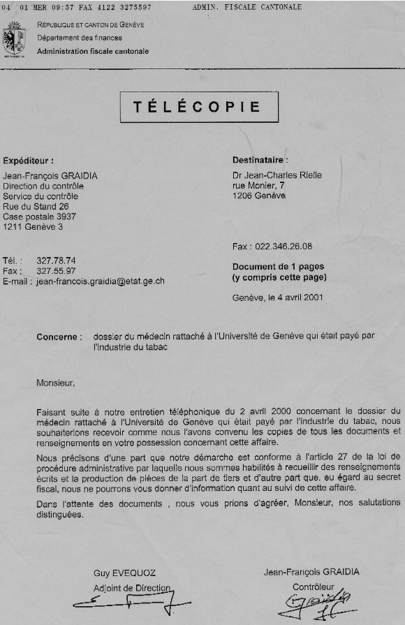 Le Rectorat enquête! L'Université de Genève a pris acte des accusations portées par deux associations anti-tabac à l'encontre d'anciens collaborateurs associés à l'institution. Conformément à la Loi sur l'Université, la Faculté de médecine a saisi le Rectorat. Celui-ci a immédiatement ouvert une enquête sur la base de l'art. 74 al. 1 i qui stipule que "le Rectorat peut être saisi par un membre de la communauté universitaire de toutes présomptions sérieuses et concordantes d'irrégularités graves d'ordre administratif ou de fraudes caractérisées d'ordre scientifique (…)." Le fisc enquête! Communiqué de presse du 29 mars 2001 avec ses liens directs notamment sur le site de Philip Morris |