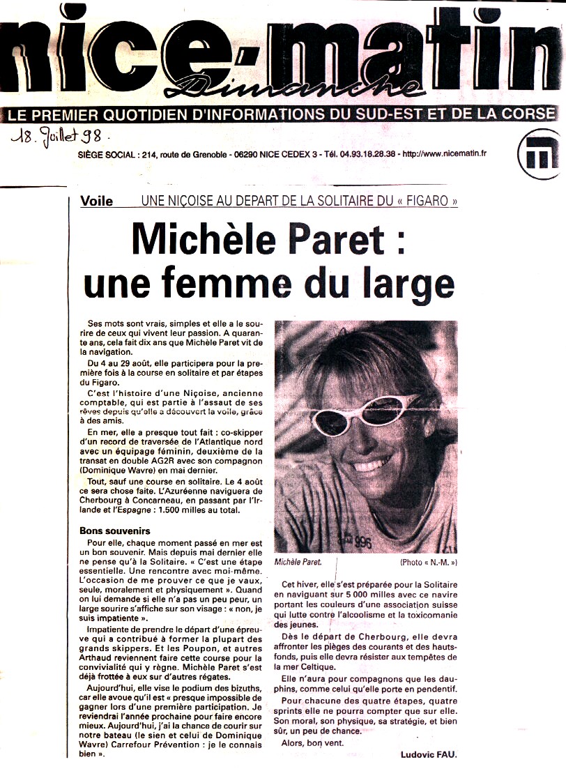 Palmarès et expérience (non exhaustif) 1996 5è de la Transat AG2R avec Dominique Wavre 1997 record de la traversée féminine de l'Atlantique (Royal Sun Alliance avec Tracy Edwards) 1998 2è de la Transat AG2R avec Dominique Wavre "Michèle Paret est une grande dame de la course au large française (deux fois équipière de voiliers ayant participé à la Whitbread). deouis quelques années, c'est en équipage réduit qu'elle navigue. Ainsi, elle prit part à trois reprises à la Tranast AG2R, dont les deux dernières en compagnie de son compagnon dans la vie et ancienne grande figure de la Solitaire, Dominique Wavre. Forte de sa grande expérience hauturière et d'un entraîneur tel que Wavre, Michèle Paret devrait réaliser une Solitaire plus qu'honorable. Le Figaro, jeudi 30 juillet 1998 articles de presse Départ et 1ère étape 2è étape 3è étape 4è étape et Arrivée |
