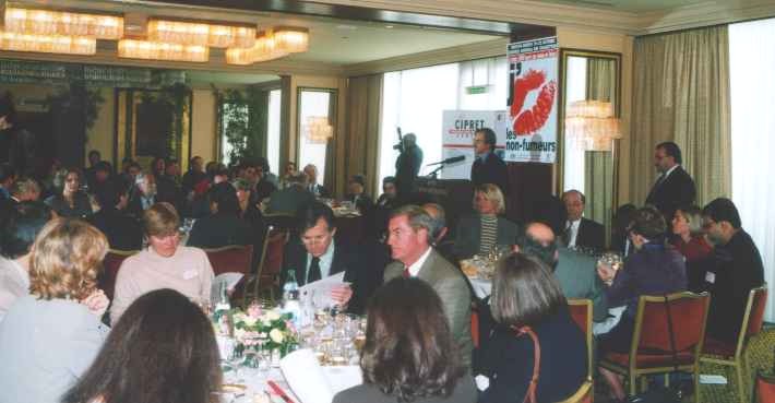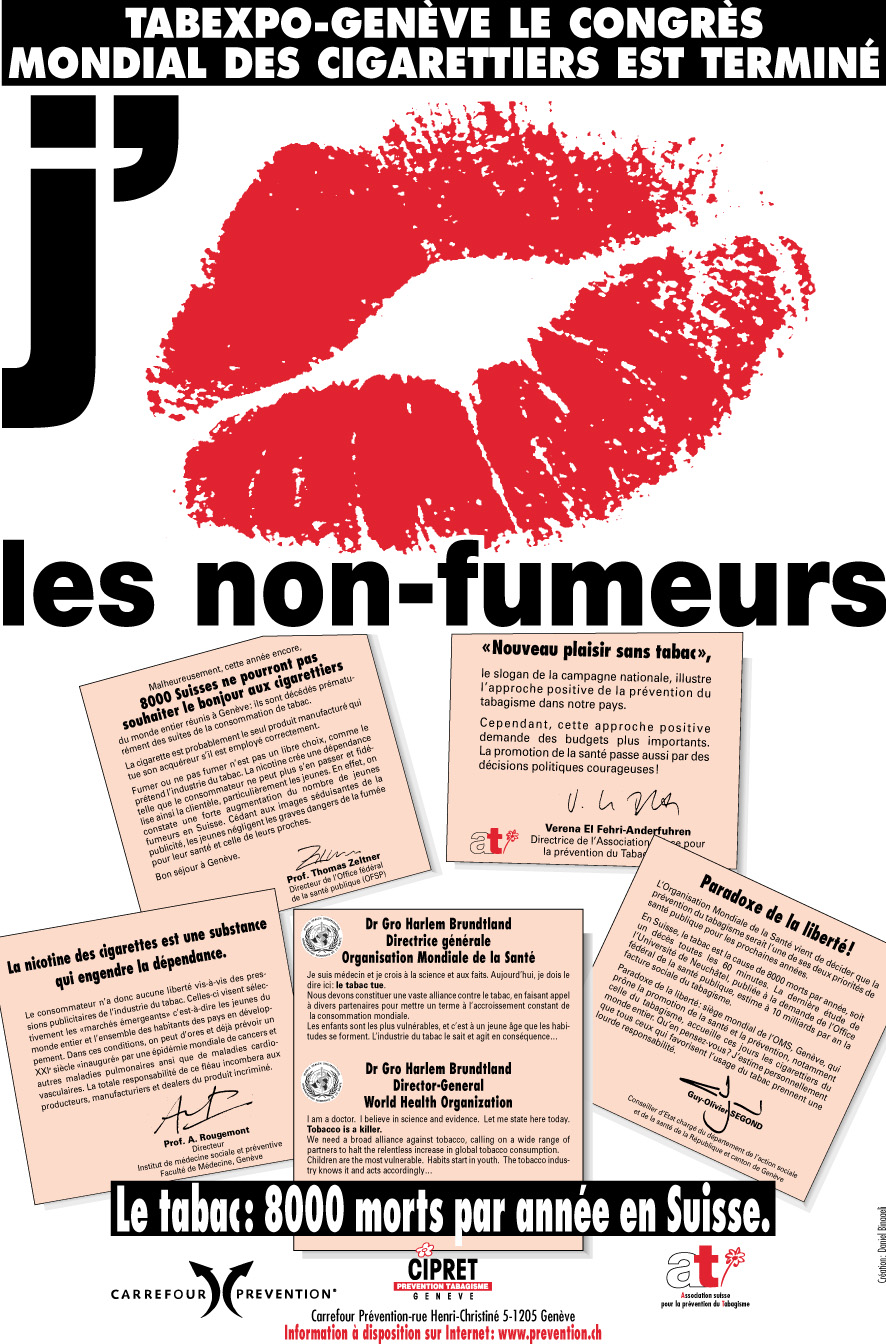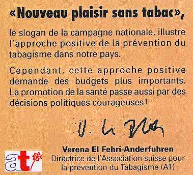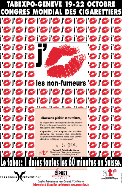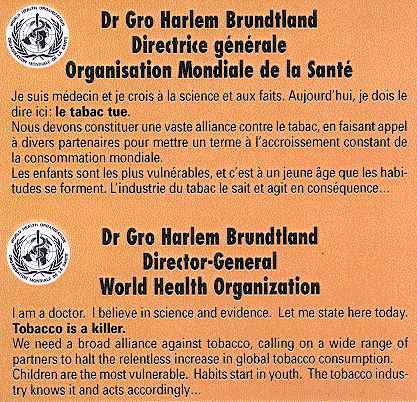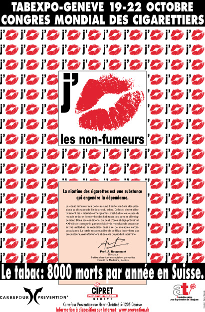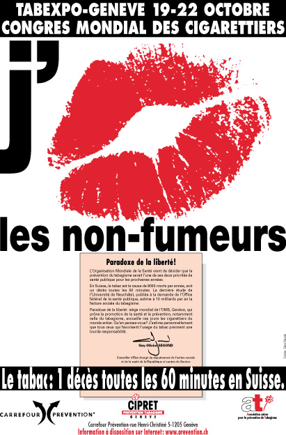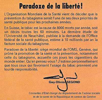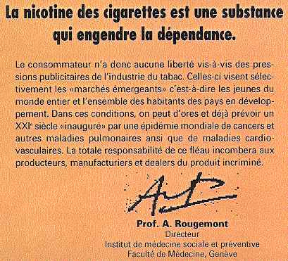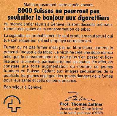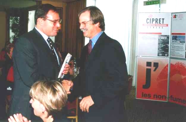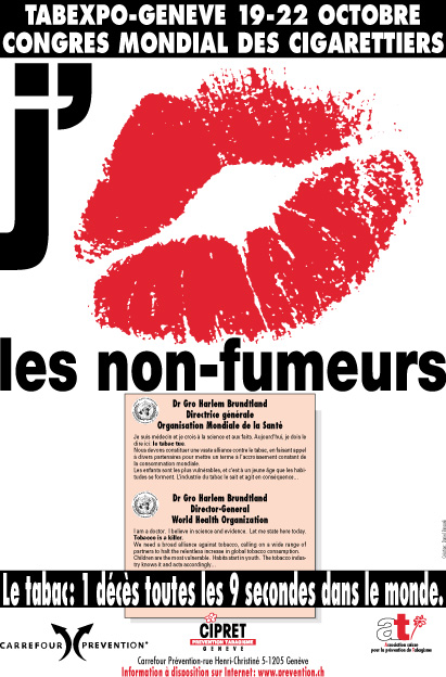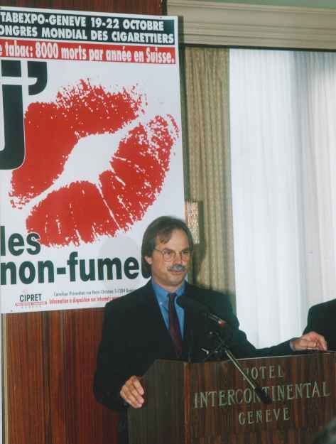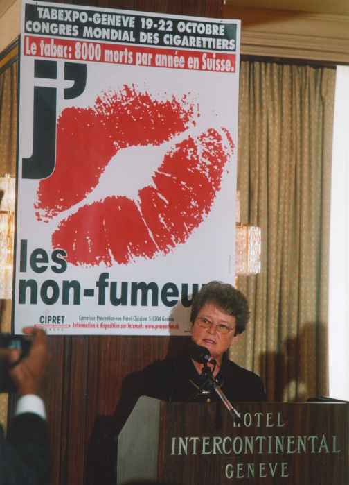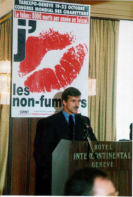 E.AldagLunch à l'Hôtel Intercontinental, Genève, lundi 19 octobre '98, avec les déclarations, ci-dessous, de personnalités dans les pleines pages des quotidiens E.Aldag E.Aldag Mme Dr Gro Harlem BRUNDTLAND Directrice générale de l'Organisation Mondiale de la Santé (OMS-WHO) Rappelons que Mme Dr BRUNDTLAND a mis la prévention du tabagisme dans les deux priorités de l'OMS pour les prochaines années! E.Aldag M. le Conseiller d'Etat Guy-Olivier SEGOND chargé du Département de l'action sociale et de la santé de la République et canton de Genève E.Aldag M. le Professeur Thomas ZELTNER Directeur de l'Office fédéral de la santé publique (OFSP) E.Aldag Mme Verena EL FEHRI directrice de l'Association suisse pour la prévention du tabagisme (AT-Berne) M. le Professeur André ROUGEMONT Directeur de l'Institut de médecine sociale et préventive, Faculté de Médecine, Université de Genève Vendredi 23 et samedi 24 octobre, les pleines pages reprenaient l'ensemble des messages et annonçaient que le congrès des cigarettiers était terminé! E.Aldag E.Aldag E.Aldag E.Aldag E.Aldag E.AldagDr Jean-Charles RIELLE (à gauche), mandatés par le ministre genevois de la santé Guy-Olivier SEGOND, ont préparé la manifestation |