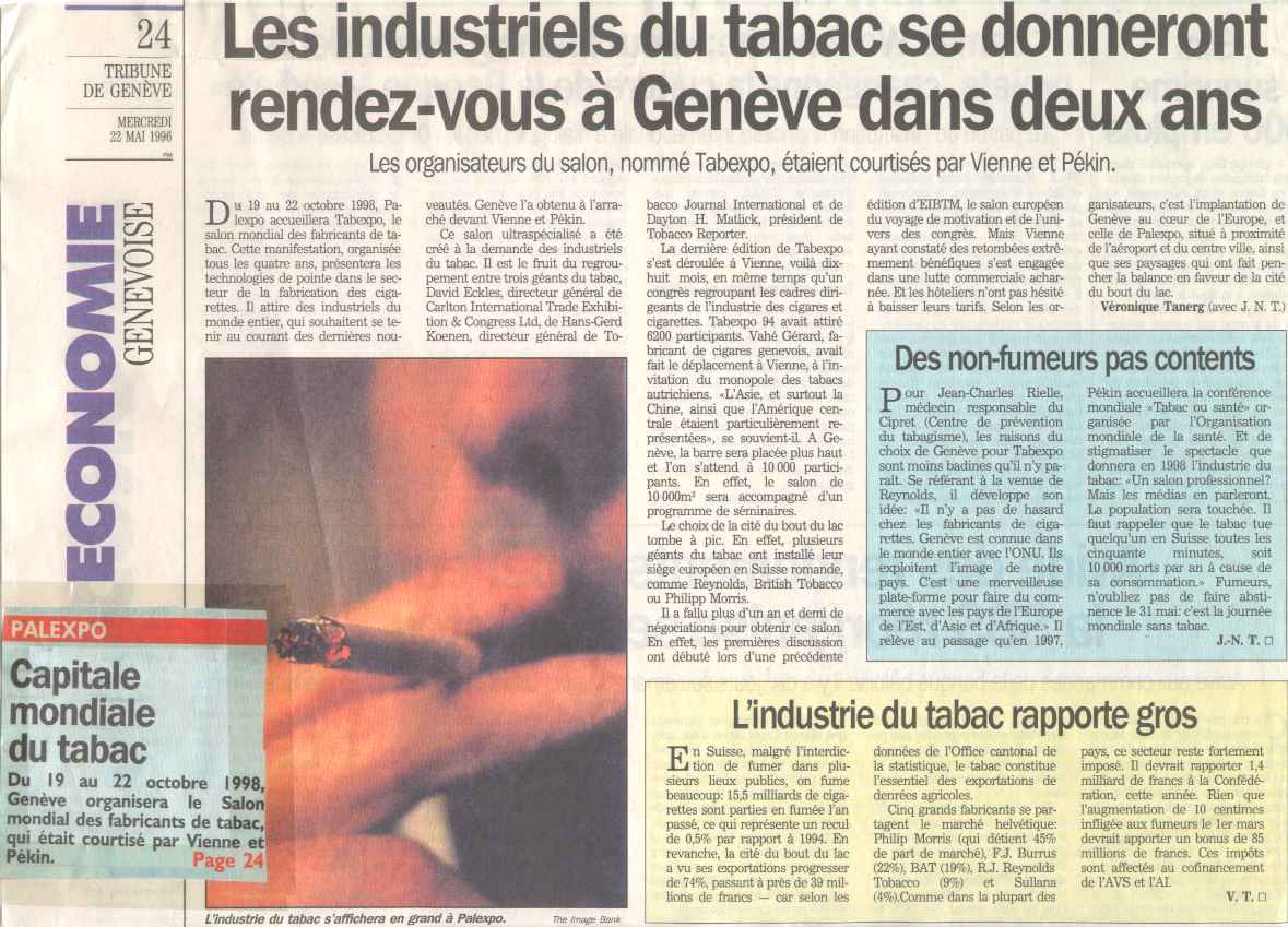 présentent "Genève accueille le Congrès mondial des cigarettiers" (Tabexpo du 19 au 22 octobre 1998) |