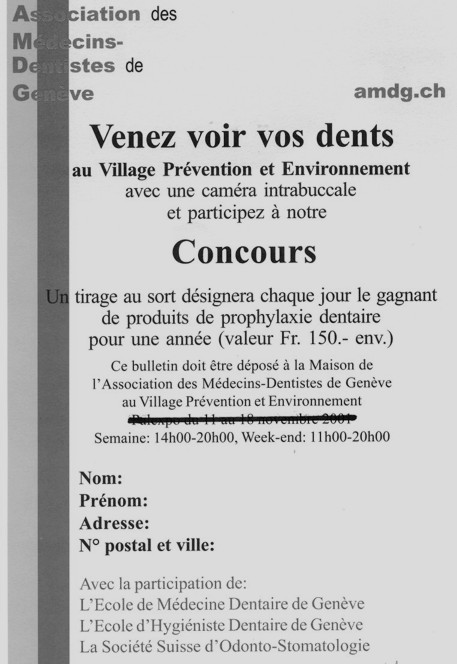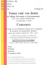 Mercredi 13 novembre Journée de l'Environnement 14h-22h Stands "Environnement" + "Agriculture" 14h-18h Clinique dentaire de la jeunesse (OJ-DIP) - Concours "Le plus beau sourire" du Village avec l'Association des Médecins-Dentistes de Genève (AMDG) 14h-18h "Le plus beau fruit ou légume" (dessin et/ou découpage) Fédération Romande des Consommateurs (FRC) 14h-18h CAD (Centre d'animation pour retraités) - Confection de bricelets 14h-16h CAD (Centre d'animation pour retraités) - Animation de peinture pour les enfants sur le thème "Dessin-moi un grand-parent" 14h-17h AIR'GO : Pour les enfants : Course de ballons Ergonomie P.M. Postures 14h-17h Couples en costumes genevois "La Colombière" du Grand-Saconnex.